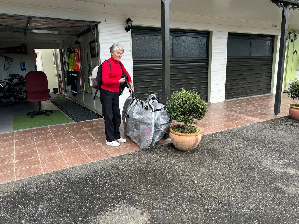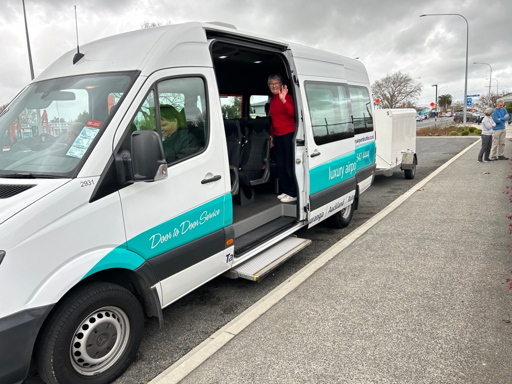 It’s finally the 14th July and we were due to catch a shuttle to the airport at 2.15pm. It arrived half an hour late in a decent sized bus towing a large trailer. Just for our bikes ! Unfortunately when he drove up to our house he realised too late he couldn’t get out again. I offered to turn it around so after a 10point turn I finally had him pointing in the right direction and we were off ( no, I gave him back the wheel)8 passengers so there was bound to be some who wanted a toilet stop at NgateaIt’s not easy checking in oversized luggage. You need to stand the bikes on their ends to negotiate the lanes.