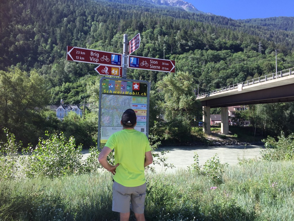Just after Lax the road zigzagged down a really steep section but by the time we reached Brig the valley was opening up and the trail ran beside the railway line for about 10 kms.